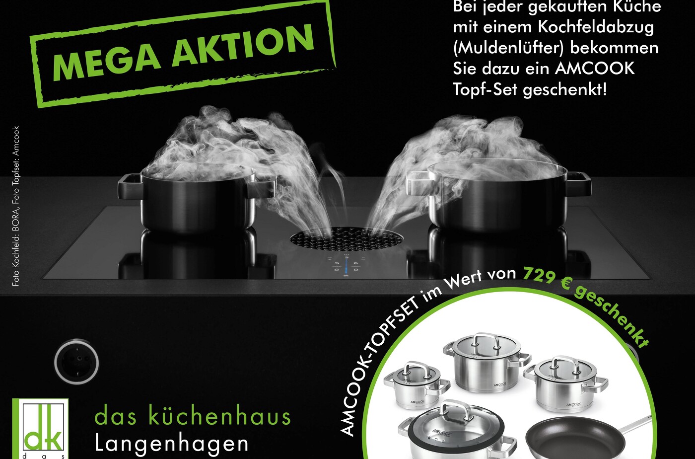 Bei jeder gekauften Küche mit einem Kochfeldabzug (Muldenlüfter) bekommen Sie ein hochwertiges AMCOOK Topf-Set dazu geschenkt!